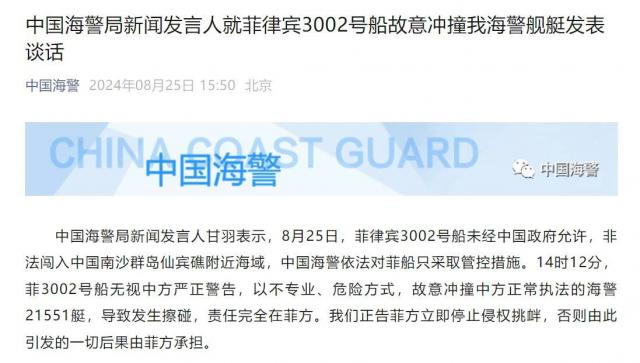 据“中国海警”微信微信官方账号消息,中国海警局发言人就菲律宾 3002 船只故意撞击我的海警舰艇进行谈话。