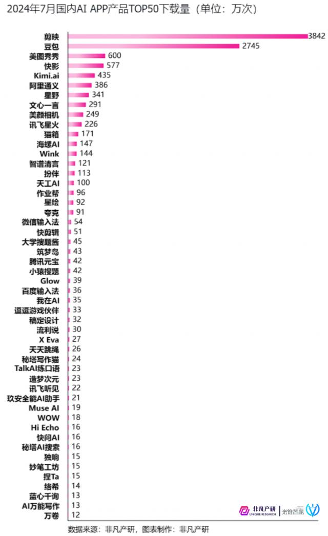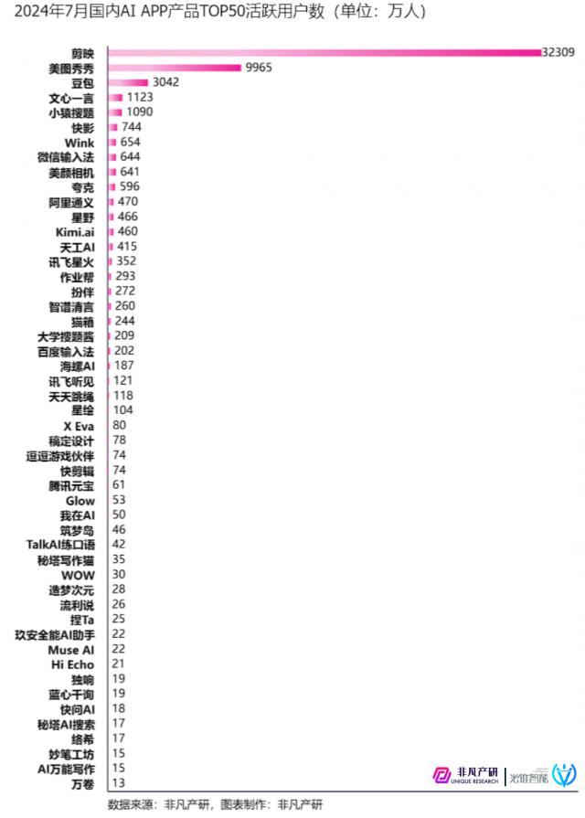 随之而来的是美图秀秀,这个应用程序致力于图像处理和美化, 9965 月活跃用户数1万,排名第二。同样来自字节跳动的豆包,作为聊天助手产品,已经实现了月活跃用户数。 3042 万,排名第三。