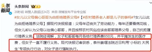 这对老夫妇已经失去了工作能力,每年都要花钱去看医生。法院最初调解的结果是,张女士和她的哥哥每个月都要付钱。 850 医疗费用分摊,但张女士一直拒绝履行义务。不得已,老人终于把女儿告上了法庭。