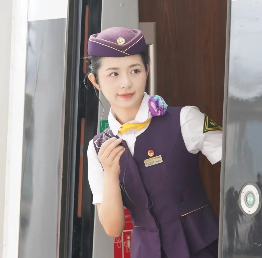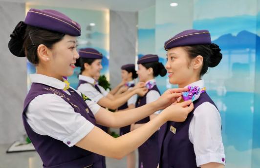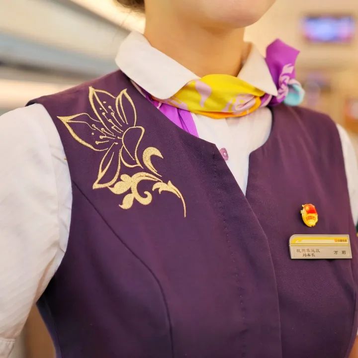 乘务员以紫色为基调的制服套装,寓意“盛世玉兰,紫气东来”,雅致中增添了灵动之美。
