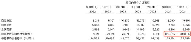 一般来说,店铺规模翻了一番,理想情况下,销量和客户应该线性增长,但瑞幸的店铺销售和用户转化率不会增加反而会下降。。其中,今年上半年,自营店同店销售额(开业一定时间以上的店铺销售额)连续两个季度出现负增长,各自减少 20.3% 和 每月平均交易客户数为20.9%。 Q1 出现环比负增长,Q2 同比增速仅为 62%,为 2023 年度同比增长率最低。