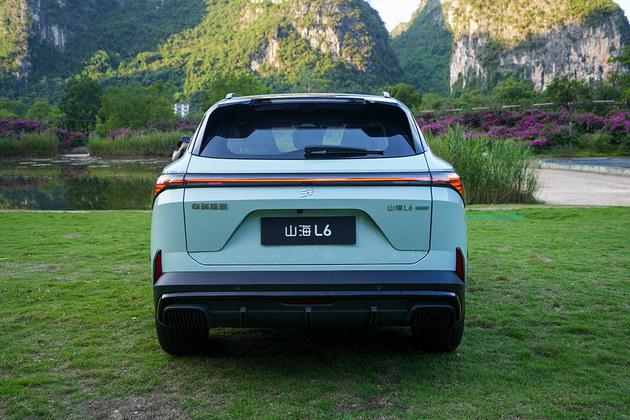 外观方面,山海 L6 采用国风美学设计,封闭的正面搭配犀利的大灯,让新车看起来非常时尚和个性化。此外,车前两侧凸起的引擎盖和导流槽设计进一步增强了新车的力量感和运动感。