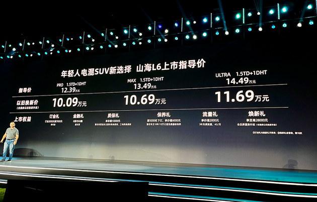 山海 L6 共推出三个版本,官方指导价格区间为 12.39-14.49 一万元,新旧置换后的价格区间为 10.09-11.69 一万元(包括我国以旧换新补贴)。另外,客户订车也可以享受无上价值。 48000 七大买车礼品块。