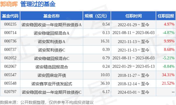 郭晓晖先生:中国国藉,硕士学位,曾在中华联合保险集团有限公司工作,从事投研工作。2017 年 3 每月加入诺安基金管理有限公司,担任基金经理助理。2018 年 11 从月开始,任诺安圆鼎定期开放债券型发起式证券投资基金主管。2018 年 12 每月任诺安鑫享定期开放债券型发起式证券投资基金基金主管。2021 年 11 月 13 日起担任诺安聚利债券型证券投资基金主管。2022 年 1 月 29 日起任诺安稳定收益一年定期开放债券型证券投资基金主管。2022 年 1 月至 2023 年 5 2021年,月任诺安优选收益灵活配置混合型证券投资基金主管 年 8 月至 2023 年 6 月任诺安稳定收益灵活配置混合型证券投资基金主管。
