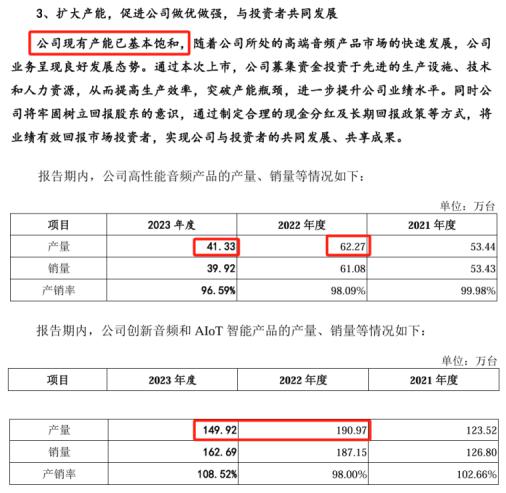 另外,汉桑科技这次 IPO 大多数拟募集资金用于提高产量,其中 2 年产高档音频产品亿元用于年产 150 万套项目;3.27 智能音频物联网产品智能制造项目使用亿元。而且汉桑科技在申报稿中表示,公司目前的产能已经基本饱和。