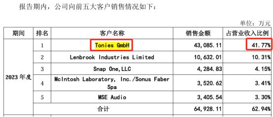 具体而言,2021 年到 2023 2008年,汉桑科技最大的客户都是 Tonies GmbH。尽管相关销售金额有所波动, 2.96 亿元、4.77 亿元、4.31 亿元,但占汉桑科技营业收入的比例却不断上升,分别是 29.08%、34.41%、41.77%。其中 2023 汉桑科技年营业收入占比超过40%。