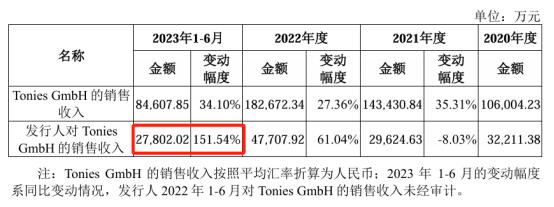 回复信显示,汉桑科技 2023 年上半年对 Tonies GmbH 销售收入为 2.78 亿元,同比增长 151.54%。即 2022 汉桑科技年上半年 2022 年上半年对 Tonies GmbH 销售收入为 1.83 亿元。