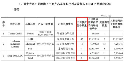 如果结合 2024 年 1 根据每月发布的咨询回复,汉桑科技和第一大客户 Tonies GmbH 它们之间有很多看点。截至 2023 年 8 月 23 日本,汉桑科技向上 Tonies GmbH 只有一种型号供应,即平均终端销售单价为 692.93 元互动早教机。汉桑科技向第二大客户和第三大客户提供的型号是 61 种和 11 种。