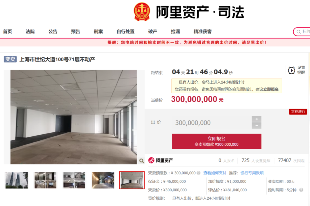 该网站显示,上海市浦东新区世纪大道100号71层房地产在阿里司法公开出售,出售起价3亿元。这是浙江省嘉善县人民法院于今年7月1日10:00至8月30日10:00开展的公开出售活动。