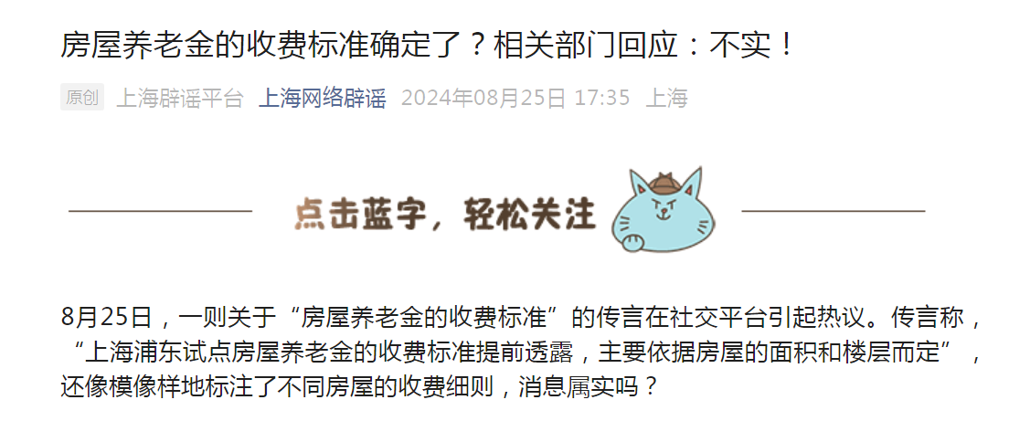 8月25日,一则关于“住房养老金资费标准”的谣言在社交平台上引起热议。传闻“上海浦东试点住房养老金资费标准提前披露,主要根据住房面积和楼层确定”,不同住房的收费规则也像样标注。这个消息是真的吗?