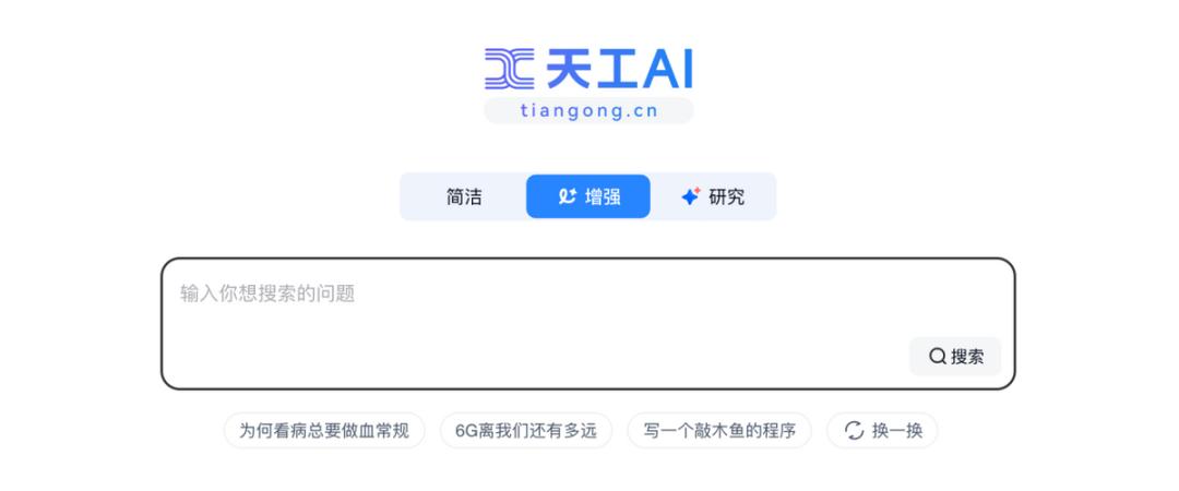比如中国第一款AI搜索产品——天工AI搜索,对AI搜索进行了相应的设计优化,引入了搜索增强模式,提高了搜索结果的及时性。它还支持多模式交互,人与机器的交流方式转向了我们最习惯的自然语言交流。客户可以像日常聊天一样询问机器,寻找信息和答案。