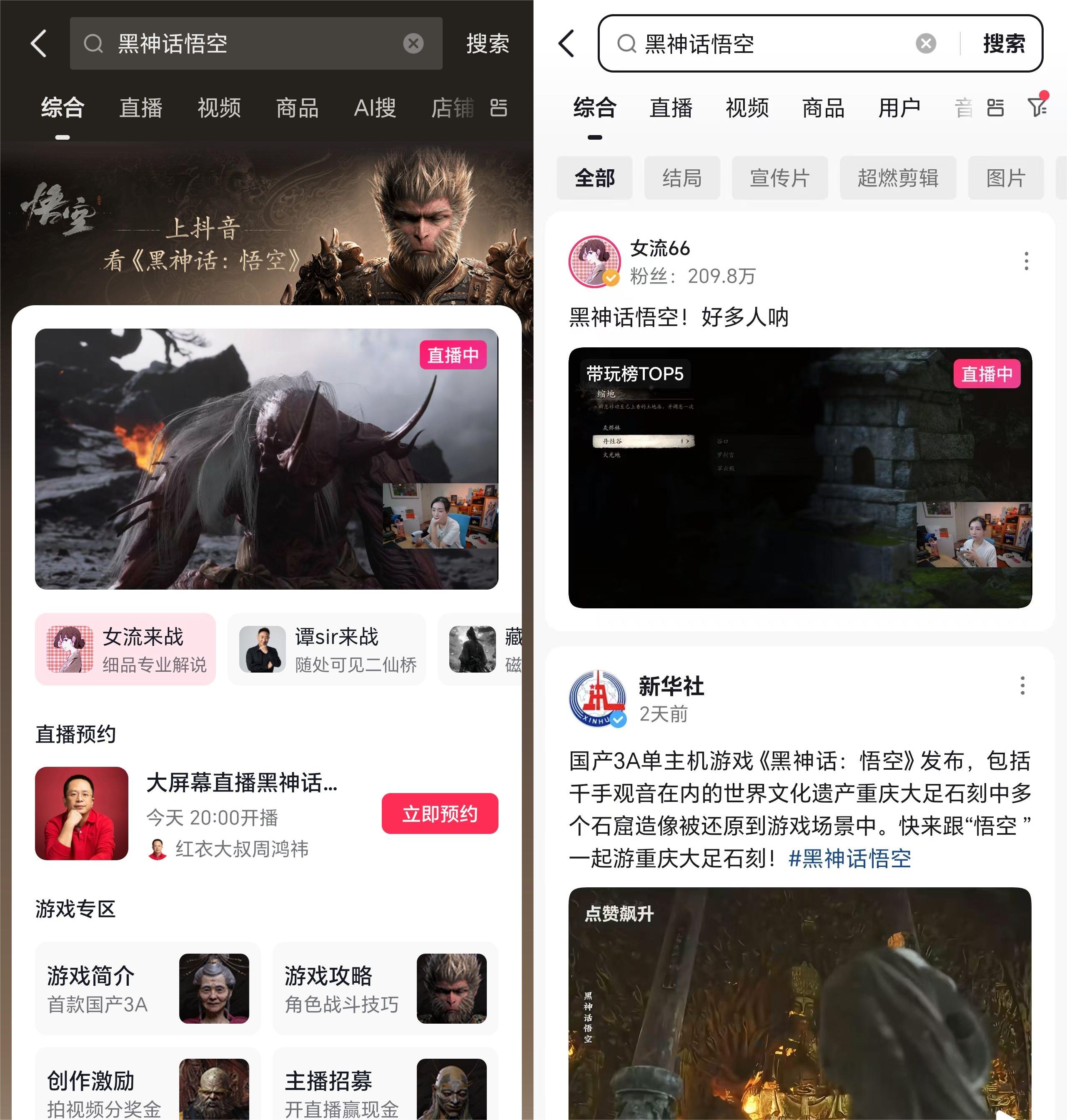 为了方便大家对比,小雷特意截取了Tiktok搜索和Tiktok对黑神话悟空的搜索内容。可以看出,两者的搜索逻辑真的很相似,直播也是优先显示,然后是商品,最后是内容。只有刷新后,Tiktok搜索顶部才会显示不同的内容,短视频的权重明显增强;Tiktok区域和产品不变,下面的内容会刷新。