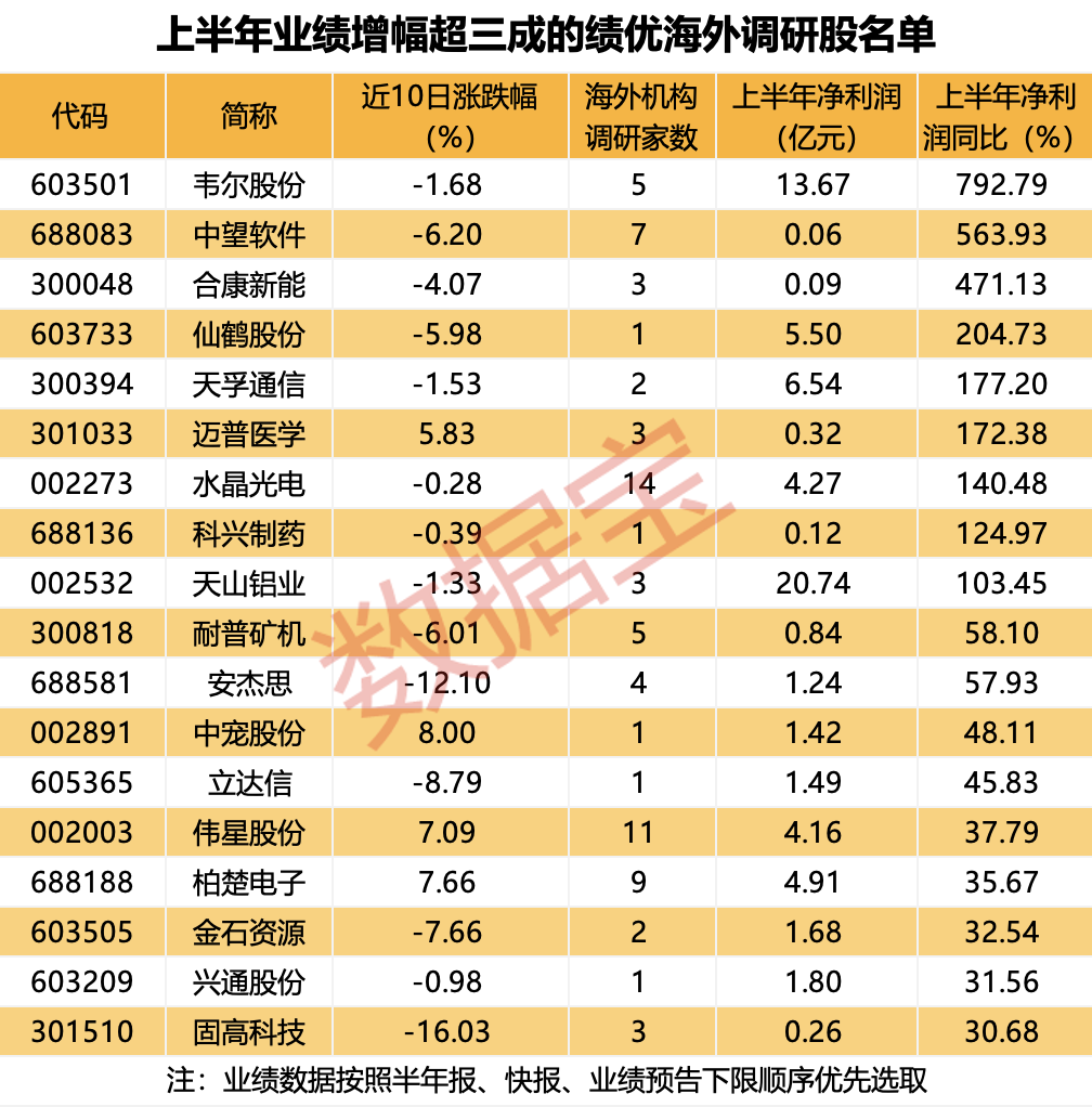 上半年,18只海外机构调研股业绩大幅增长,均盈利且同比增长30%以上。韦尔股份,中望软件,合康新能,鹤股份同比增长792.79%的净利润、563.93%、471.13%和204.73%。