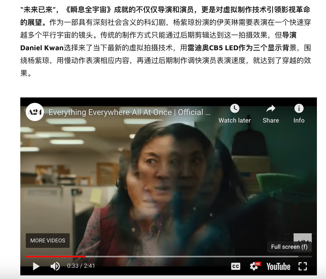例如,《瞬息全宇宙》获得了第95届奥斯卡的7个奖项,其中最关键的杨紫琼扮演的伊芙琳通过雷迪奥的LED构建了一个穿越空间的场景。