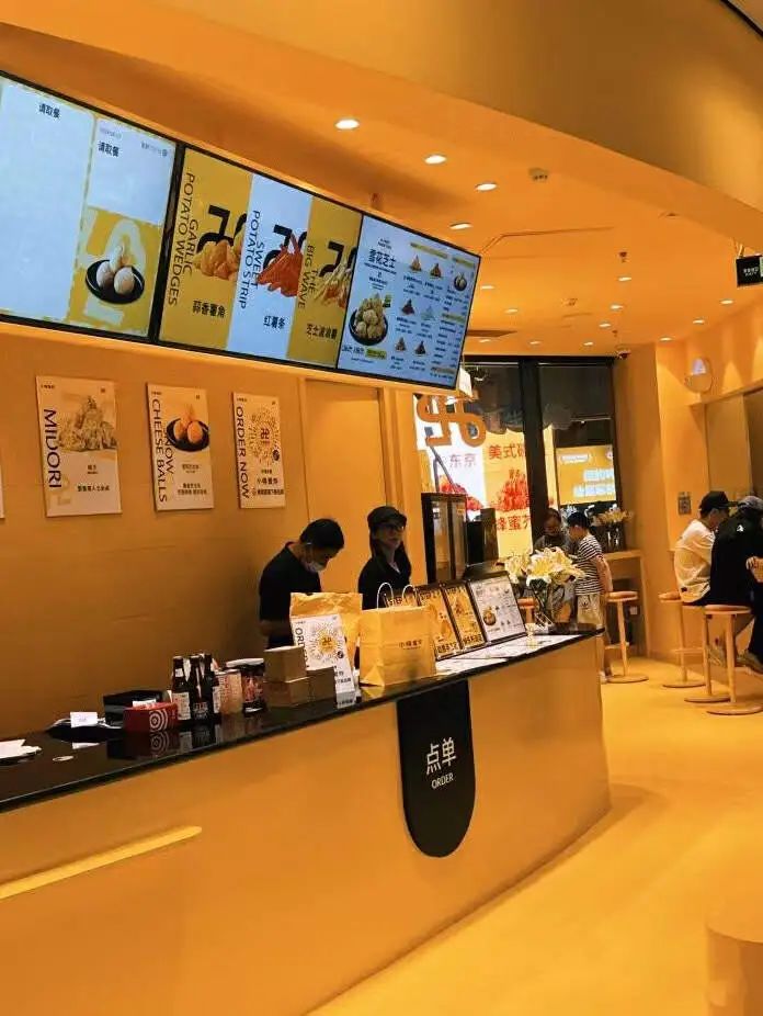 店面面积约70平方米,以“Fendi黄”为基调,设有一些用餐区、自助饮料区、用餐区等。从墙壁到地板再到桌椅,都是明黄色的,整体设计活泼年轻,顾客可以从出口看到厨房操作。