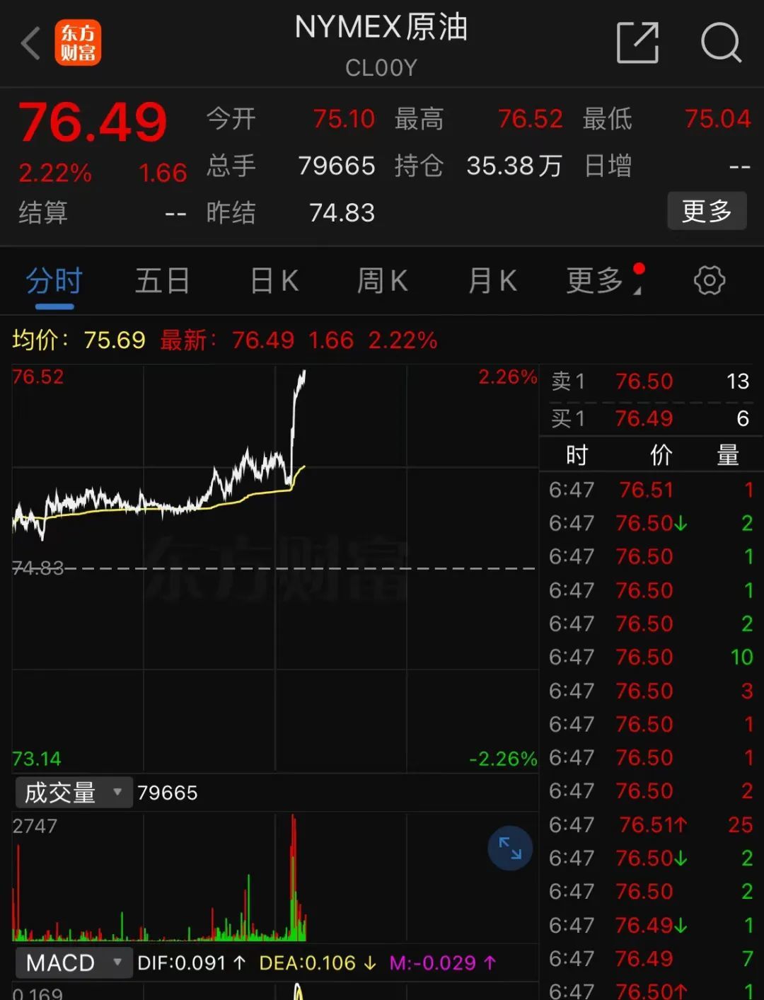 消息传出后,油价暴涨。到目前为止,NYMEX石油已经超过76美元/桶,上涨了2.22%。;现在布伦特石油上涨了1.7%。