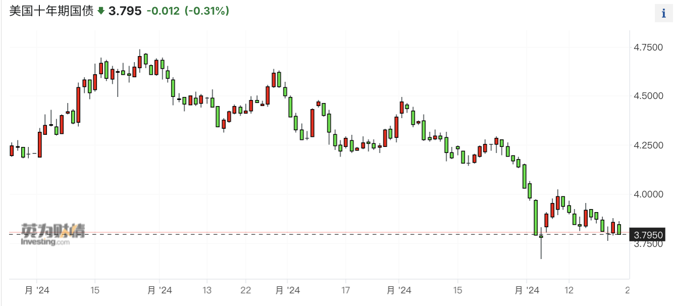 美国债券收益率迅速下降,美国两年期美国债券收益率为3.909%,十年期美国债券收益率为3.795%,去年最高点一度超过5%。这也意味着债券市场在政策利率下降之前就已经下降了。