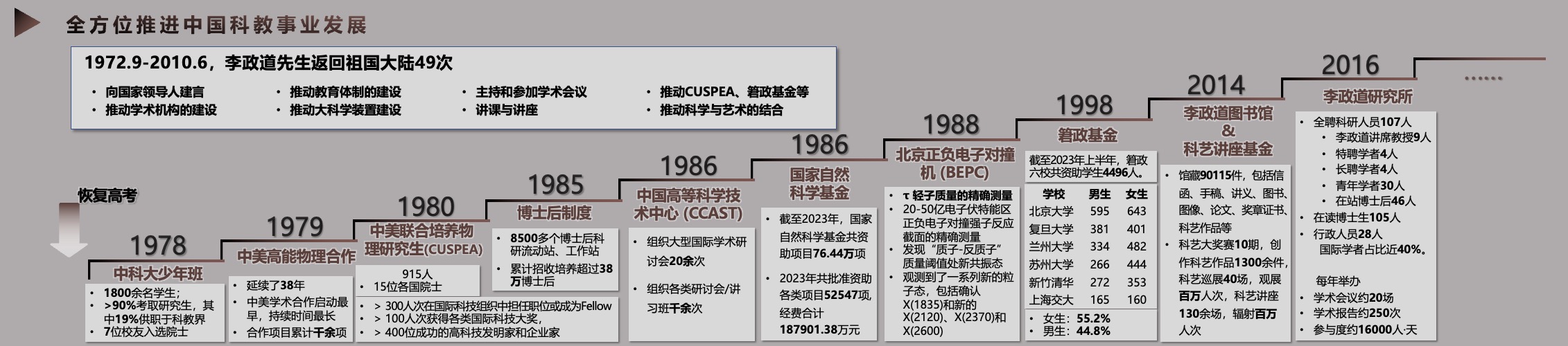 从1972年李先生第一次回国浏览开始,到2010年最后一次回国,李政道在38年内回国49次,为祖国科技事业和人才培养事业的发展做出了许多基础贡献,影响非常长远。