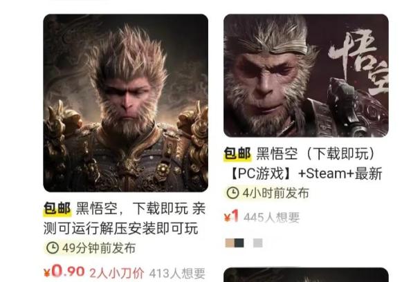 目前,大量超低价格的黑神话:悟空盗版交易数据出现在多个交易平台上,如“1元黑悟空下载即可播放”、“9.9元黑神话”等。