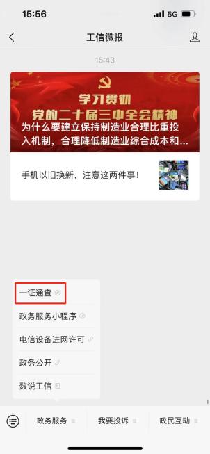 “政务服务”频道设在“工信微报”内,选择“一证通查”。