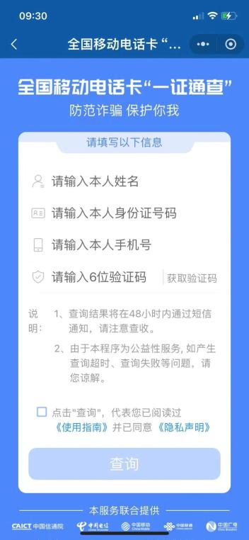 您可通过国务院客户端、工业和信息化部政务微信号“工业和信息化微报”和“工业和信息化部反诈骗班”、微信公众号“中国信通院”,以及微信、支付宝“一证通查”小程序等平台查询。