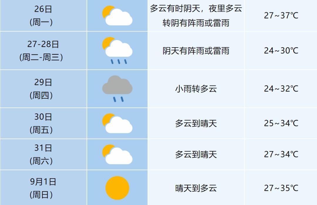 28日(周三):全省阴天到多云,许多地区都有阵雨或雷雨,其中淮河以南的局部下雨。
