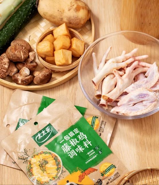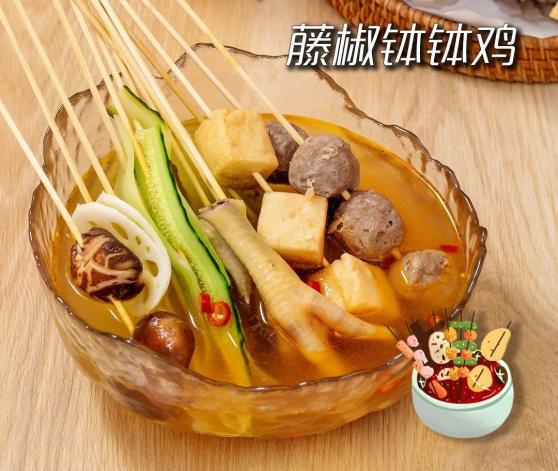 取出藤椒鸡调味品,将酱包倒入碗中,加入冰水不过串,浸泡30分钟即可享受美食~