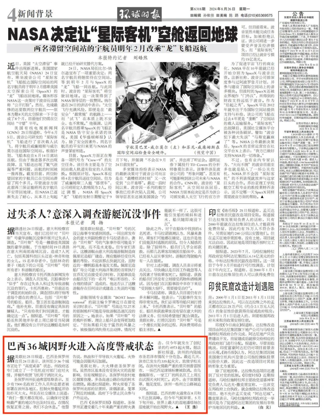 据美联社25日报道,巴西圣保罗州官员24日表示,该州至少有36个城市处于“高度警惕”状态,该州政府还专门成立了一个危机处理部门来应对火灾,并租用了额外的飞机进行灭火。