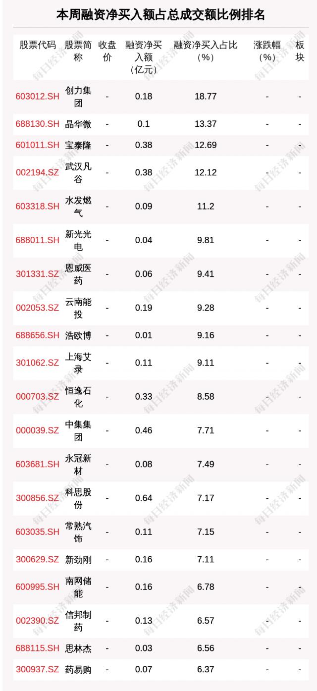 两市共有 5 只有股票融资净买入大约占成交额的比例超过成交额。 10%,其中创力集团、晶华微、宝泰隆排名前三,分别占比。 18.77%、13.37%、12.69%。