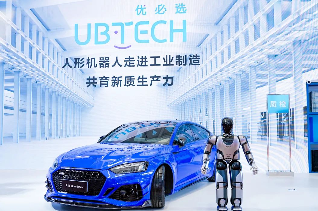 优必选的 Walker S 一系列人形机器人,在展台上给奥迪 RS5 轮胎现场进行质量检验;