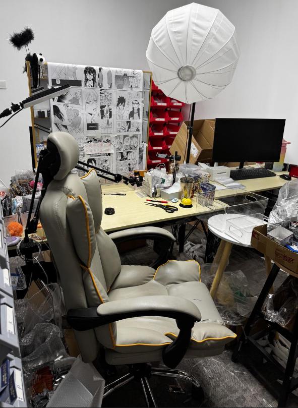 一个普通的隔断,两张桌子,装备直播用的支架和灯光,有实力的加几排放卡包的架子。一个拆卡直播间建成后,整体成本只有几千元。