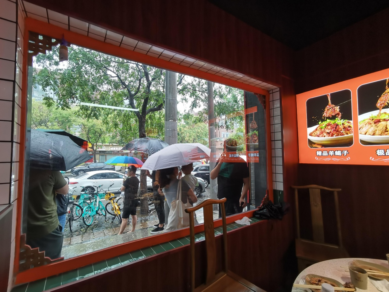即便如此,8月26日上午10点,当《ThePaper》记者进店时,店里已经有几个顾客占了好座位,提前看菜单。急着11点正式吃饭的客人已经需要排队了。记者注意到,不到中午12点,他们已经到了29号。随着越来越多的人在等待,顾客只能带着伞在店外排队。