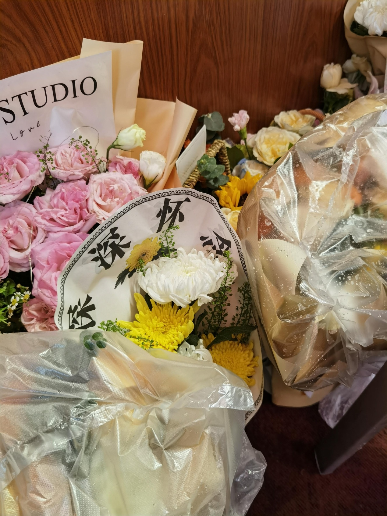 栾留伟的火锅店里,沿着酒吧摆满了鲜花。有的上面插着卡片,有的上面挂着带雨滴的塑料袋。一束黄色和白色的菊花用白纸包裹,上面写着“深深的怀念”。