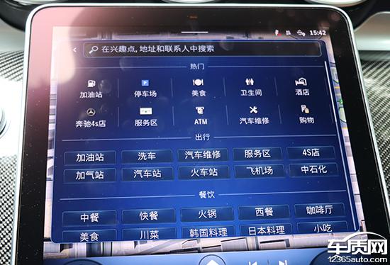 2024 款奔驰 CLE 轿跑内置定制版高德地图,界面布局清晰直观,搜索框位于顶部,提供多种搜索方式。值得一提的是,导航系统预设了很多方便快捷的目的地,分为几类,内容相当丰富。热门目的地位在顶部,包括加油站、停车场、奔驰 4S 商店等,日常使用非常方便。