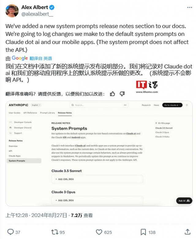 Anthropic 亚历克斯开发者关系负责人・艾伯特(Alex Albert)在 X 上面发表的一篇文章说,Anthropic 计划在更新和微调系统提示的过程中,定期发布此类信息。