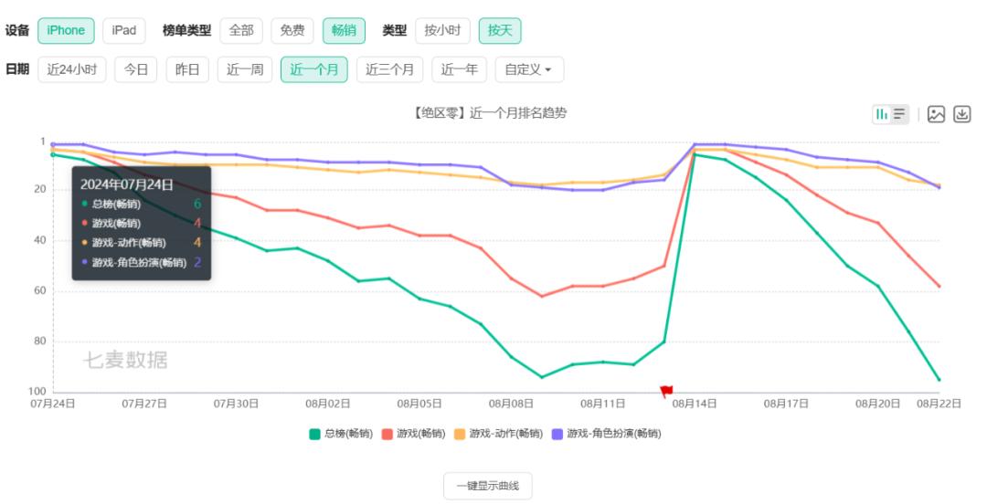 以今年上线引起不同程度关注的三款二游为例:烛龙的《白荆走廊》,第一次测试后最好的结果是畅销榜第13位,最近三个月排名100位以外;库洛游戏《鸣潮》上线后排名第九,历史最高成绩排名第六,与当时角色长距离卡池的开启有关;米哈游的《绝区零》上线后,最佳成绩排名第四,距离超抖一步之遥。最近卡池更新了好几次。排名上升到第六位,但随后下降。