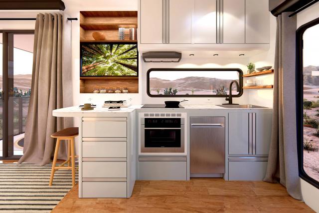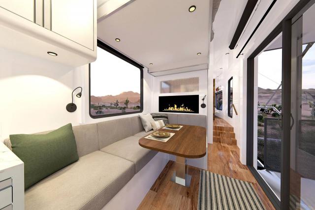 作为 Living Vehicle GT39新旗舰产品 提供宽敞的居住空间,天花板高8英寸,内置大厨房 / 用餐区,配有酒吧、家庭影院、电子壁炉,以及可以容纳几把椅子和一张桌子的折叠甲板。再次看看主卧套房,u200bu200b同样设施齐全,有超大床、储物柜、柚木镶板淋浴房,高档装饰和顶级家用电器一应俱全。