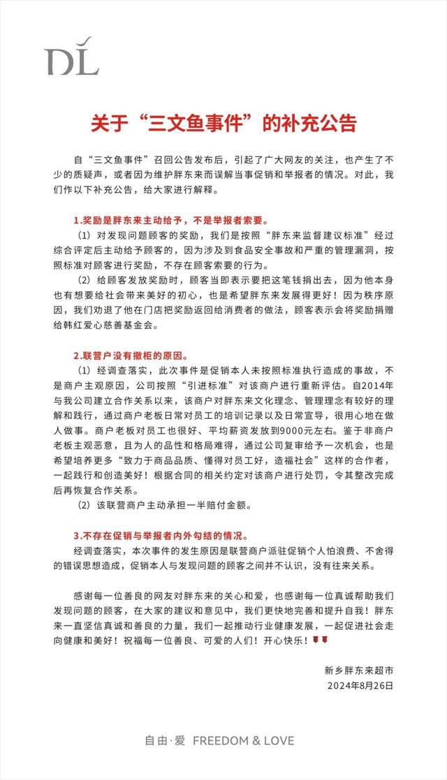 26 日晚,据新乡胖东来微信官方账号消息,自“三文鱼事件”召回公告发布以来,有不少疑问,对此进行了补充公告: