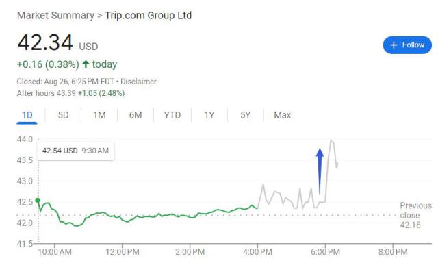 财务报告公布后,周一收涨近 0.4% 美国上市中国证券交易所携程盘后加速上涨,盘后涨幅一度接近。 后期涨幅收窄4% 3% 之内。