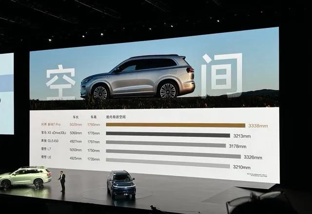 余承东在新闻发布会上对M7进行了特别比较。 理想的Pro和L7、感觉M7的L6空间 在数据方面,Pro舱内有效空间达到3338mm。嗯,又学到了一个新词——舱内有效空间。
