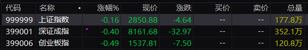 三大指数集体低开:上证指数下跌0.16%,消费电子等板块指数跌幅居前。