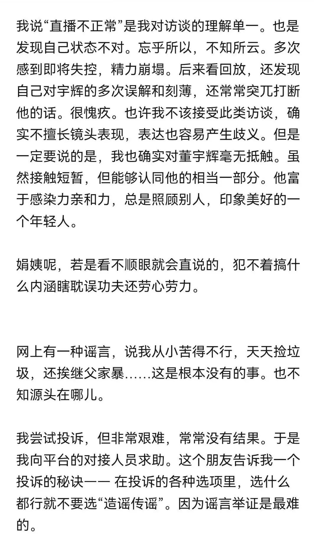 说“直播不正常”是我对采访的单一认识。还发现自己的状态不对。目空一切,不明内心。感觉好几次都要失控,精力崩溃。后来看了回放,还发现自己多次误解和刻薄宇辉,还经常生硬地打断他的话。很愧疚。也许我不应该接受这种采访,的确不擅长镜头表现,表达也容易产生歧义。但必须说的是,我的确对董宇辉毫无抵触。虽然接触很短,但是能认出他的相当一部分。他富有感染力和亲和力,总是照顾别人,给人留下好印象。