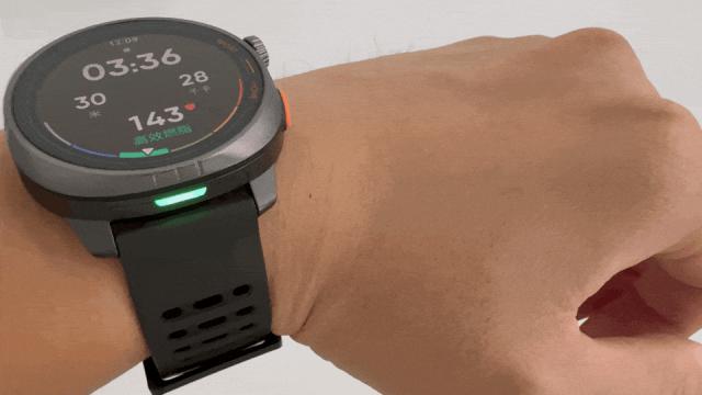 同时,作为差异化和特色设计,手表下方还有心率显示灯。它可以显示蓝色、绿色、红色等。 6 各种颜色反馈当前运动时的心率状态。直观清晰,避免了还要点亮手表查看,让运动不分心。