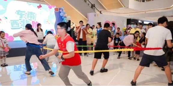 这个游戏需要父母和孩子一起参与。随着主持人的哨声,站在拉力带里的父母同时用力,手里拿着贴纸伸向前面的宝宝,得到贴纸最多的孩子获胜。