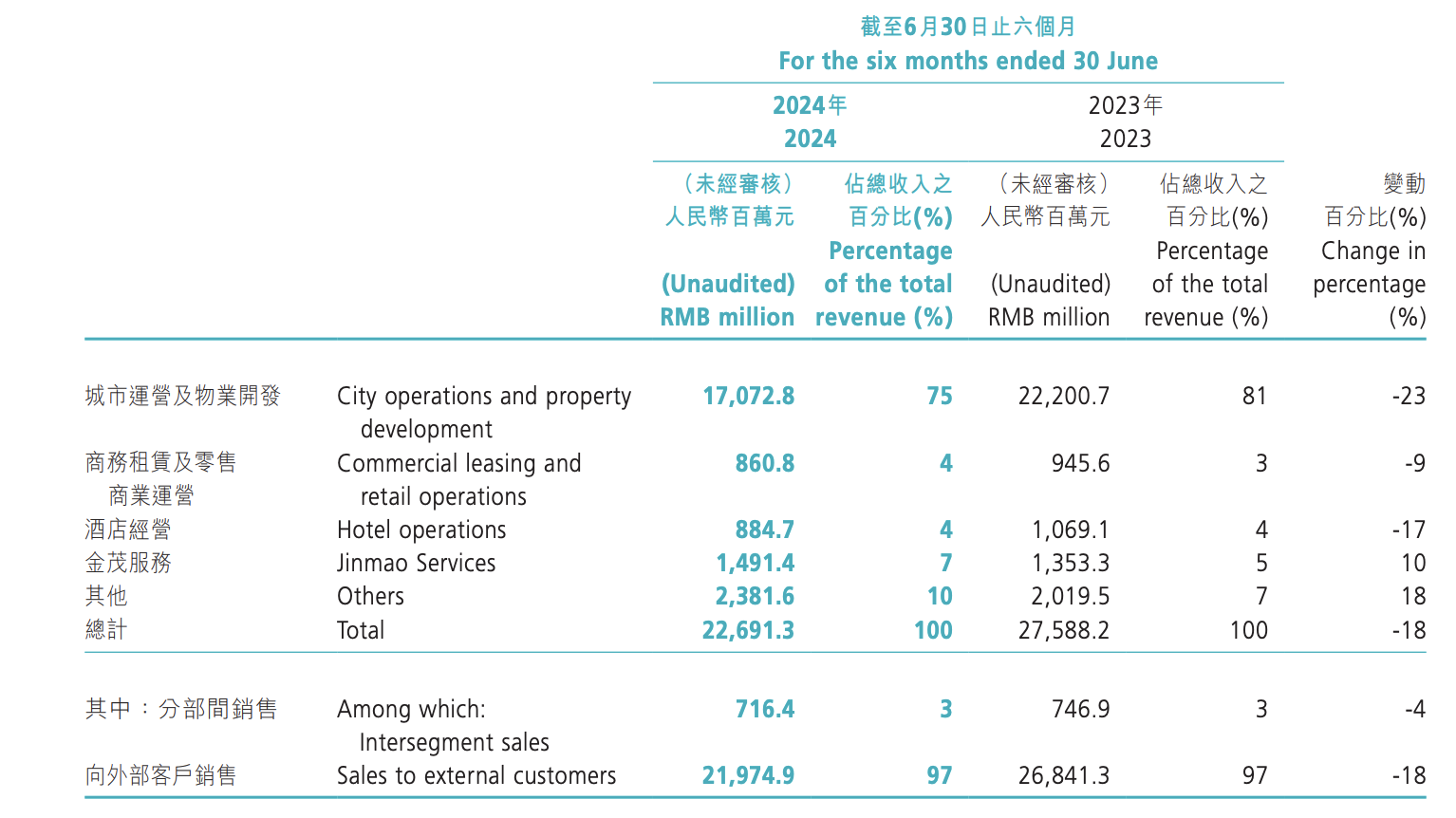 财务报告数据显示,2024年上半年中国金茂收入约219.74亿元,同比下降18%。关于下降的原因,中国金茂在财务报告中解释说,与2023年上半年同期相比,城市运营和物业开发、商业租赁和零售业务运营以及酒店经营收入均有所下降。
