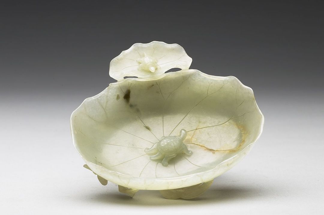 笔洗立雕成两片荷叶,大荷叶为器身,小荷叶与下面雕刻的慈菇茎形成耳朵,很有意思。两片荷叶表面各有一只乌龟,荷叶底部有一只浅浮雕,充满活力。从宋代开始,龟游荷叶就成了玉石的主题,意味着长寿,这也是皇帝美德的吉祥。