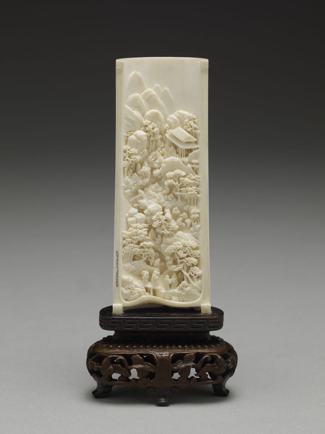 凹曲面左下阴刻填充黑楷:“乾隆己未(1739)季冬,小臣黄振效恭制。”黄振效是一位来自广东的牙匠,他在乾隆工作了两到九年。本器精雕细刻,体现了广东的牙雕风格。