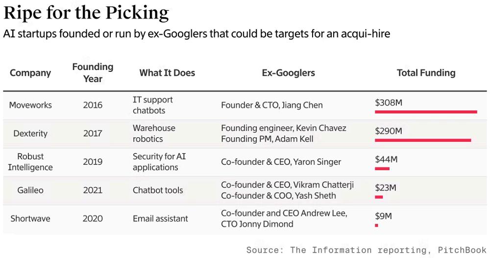 此外,谷歌还有5家AI创业企业已经一年多没有融资,将面临资金问题,因此可以被视为大型企业的潜在收购对象。