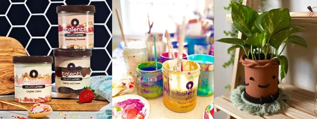 Talenti罐装除了Gelato品类自身的优势和产品的即时可用性外,不仅有效还原了Gelato的视觉体验,还将Gelato透明罐发布在社交媒体平台上,将Gelato透明罐改造成颜料调色容器、花盆、沙拉盒等二创器皿,引起粉丝互动和分享。
