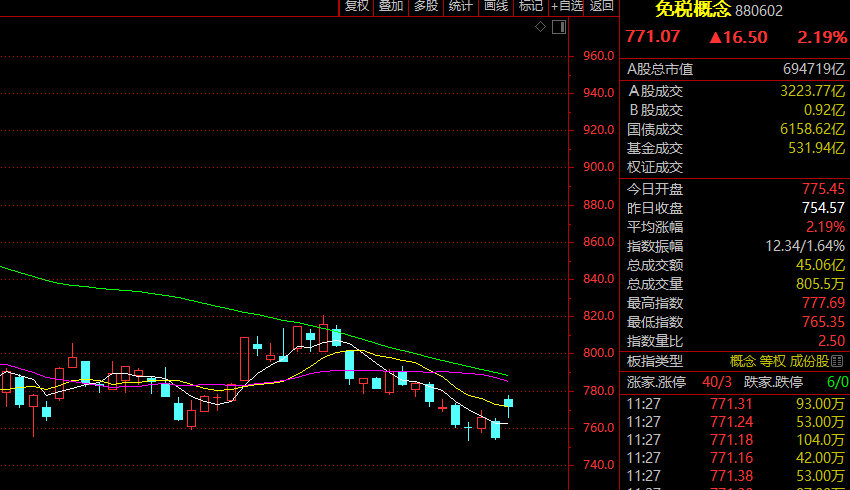 上午免税概念大幅上涨,板块指数盘中一度上涨超过3%,开盘不到一小时就超过了昨天的全天交易。中百集团、东百集团等多芯开盘涨停,友好集团等也是大幅高开后极速封板,龙头股中国中免一度涨幅超过4%。